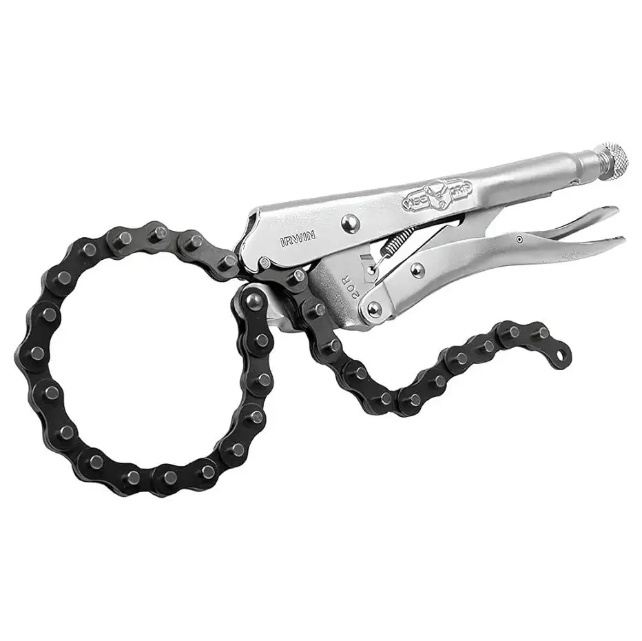- Mecanismo de cadena que sujeta y bloquea alrededor de piezas de cualquier forma o tamaño — ideal para piezas irregulares, tubos, láminas y trabajos en formas difíciles.